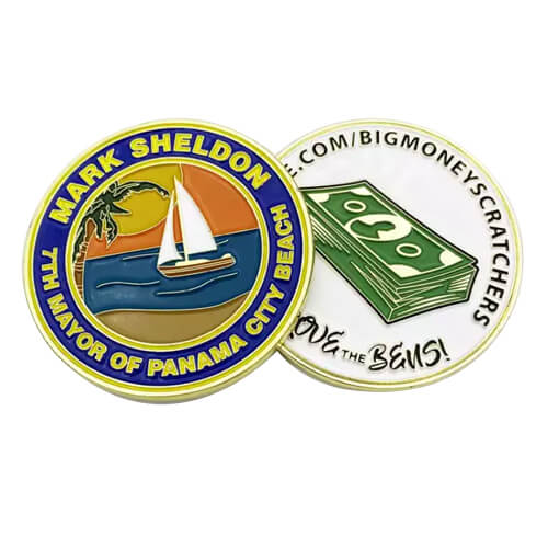We make corporate coins with durable materials like iron, zinc alloy, or brass, and painted with vibrant enamel colors or printed logos. the popular sizes are 1.75″ and 2″ in round shape. surely, we can customize the coins in any size and any shape.