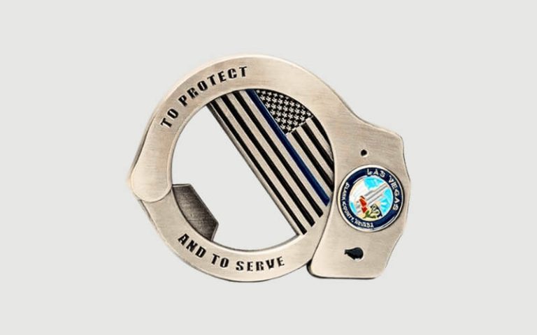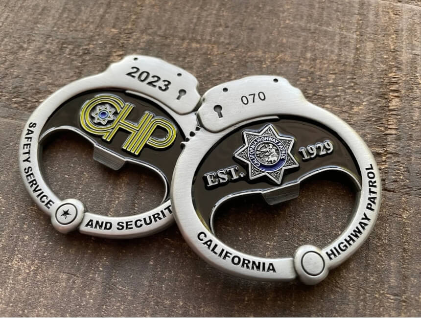 Handcuff challenge coins feature a handcuff-shaped bottle opener, combining practical use with a powerful design that symbolizes police work. It combines functionality and symbolism.